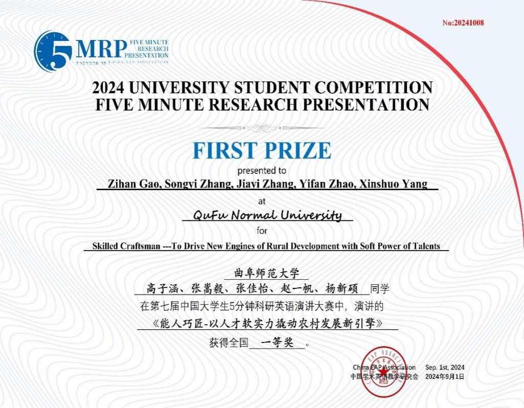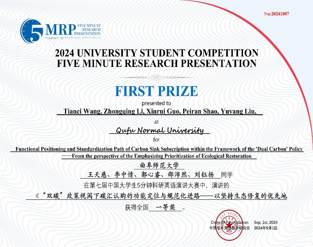 日前,第七届中国大学生5分钟科研英语演讲大赛决赛成功落下帷幕。由我校选拔推荐的39支团队在本次大赛中再创佳绩,获得全国一等奖2项、二等奖8项、三等奖12项、优胜奖17项。其中,由王天慈、李中情、郭心睿、邵沛然、刘钰杨等同学组成的团队作品“Functional Positioning and Standardization Path of Carbon Sink Subscription within the Framework of the ‘Dual Carbon’ Policy —— From the perspective of the Emphasizing Prioritization of Ecological Restoration”和由高子涵、张嵩毅、张佳怡、赵一帆、杨新硕等同学组成的团队作品“Skilled Craftsman ——To Drive New Engines of Rural Development with Soft Power of Talents”荣获全国一等奖。