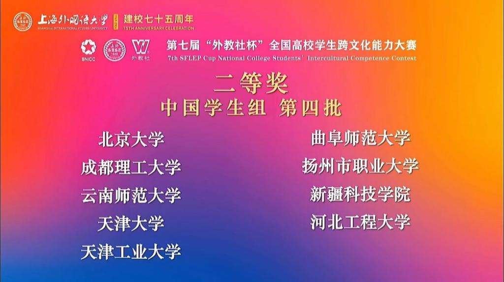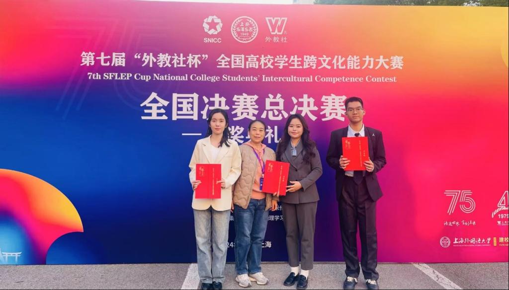 11月28日-12月1日,第七届“外教社杯”全国高校学生跨文化能力大赛在上海外国语大学成功举办。由巩奕含(统计与数据科学学院)、崔又心(统计与数据科学学院)、杨浩然(外国语学院)组成的开运体育·(中国)有限公司官网代表队荣获全国二等奖,开运体育·(中国)有限公司官网副教授仲蕾荣获优秀指导教师奖,这是开运体育·(中国)有限公司官网在该项赛事中首次荣获国家级奖项,取得历史性突破。
