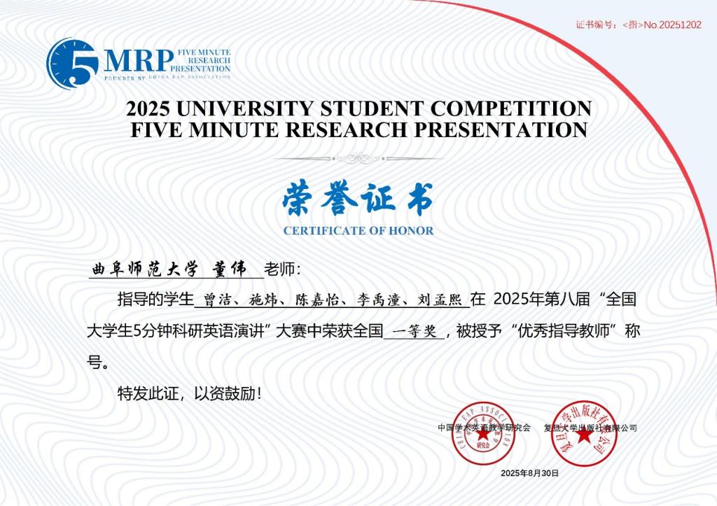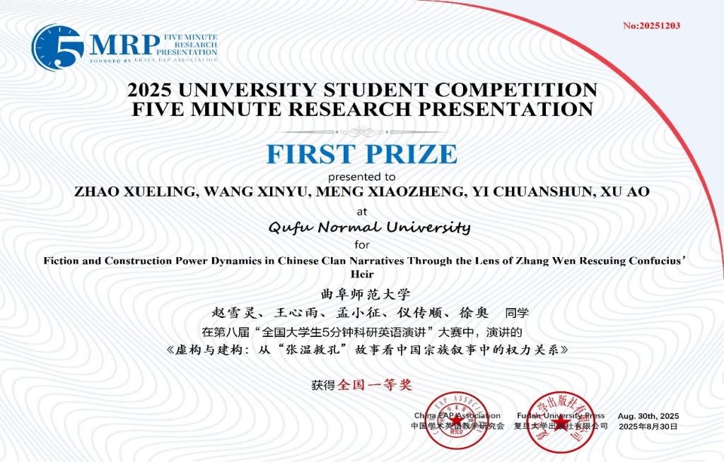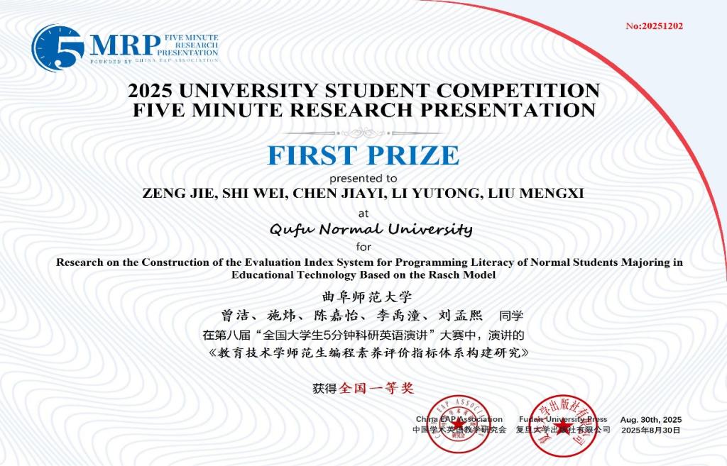 近日,第八届全国大学生5分钟科研英语演讲大赛决赛在河南洛阳古城成功落下帷幕。由我校选拔推荐的39支团队取得优异成绩,获得全国一等奖2项、二等奖8项、三等奖12项、优胜奖17项。其中,由曾洁、施炜、陈嘉怡、李禹潼、刘孟熙等同学组成的团队作品“Research on the Construction of the Evaluation Index System for Programming Literacy of Normal Students Majoring in Educational Technology Based on the Rasch Model”和由赵雪灵、王心雨、孟小征、仪传顺、徐奥等同学组成的团队作品“Fiction and Construction Power Dynamics in Chinese Clan Narratives Through the Lens of Zhang Wen Rescuing Confucius’ Heir”荣获全国一等奖;黄雪娇、董伟等老师荣获优秀指导教师奖。