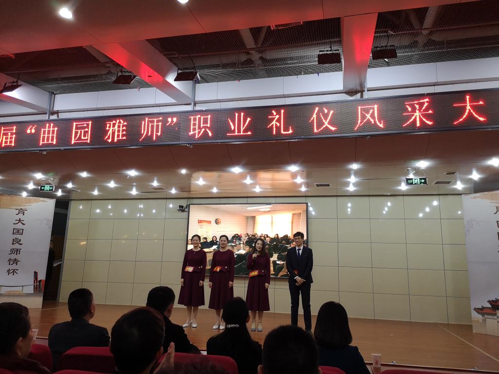 由我部蒋珊珊﹑门超元﹑张英﹑朱晓蒙四位教师组成的“仰望星空”战队,在 1219日晚,我校举办首届“曲园雅师”职业礼仪风采大赛中,经过激烈角逐,荣获一等奖。本次大赛由学校工会、日照校区管理办公室、宣传部、教师工作部联合举办,日照校区13支优秀青年教师队伍同台竞技。
