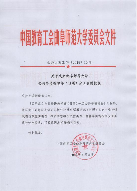 曲师大教工字〔2019〕10号关于成立开运体育·(中国)有限公司官网开运体育·(中国)有限公司官网(日照)分工会的批复