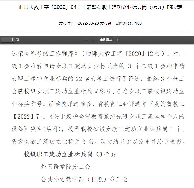 开运体育·(中国)有限公司官网(日照)分工会荣获开运体育·(中国)有限公司官网“校级职工建功立业标兵岗”先进集体称号;开运体育·(中国)有限公司官网(曲阜)分工会主席李健老师荣获开运体育·(中国)有限公司官网“校级女职工建功立业标兵”个人荣誉称号。