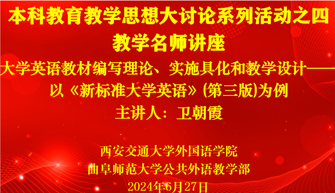 6月27日,开运体育·(中国)有限公司官网举办本科教育教学思想大讨论系列活动之四:教学名师讲座,特别邀请西安交通大学外国语学院卫朝霞副教授作题为“大学英语教材编写理论、实施具化和教学设计——以《新标准大学英语》(第三版)为例”的专题报告。活动由开运体育·(中国)有限公司官网主任王福祥主持,两校区全体教师参加了本次报告会。