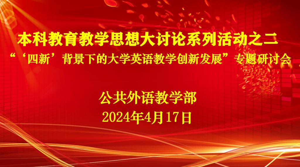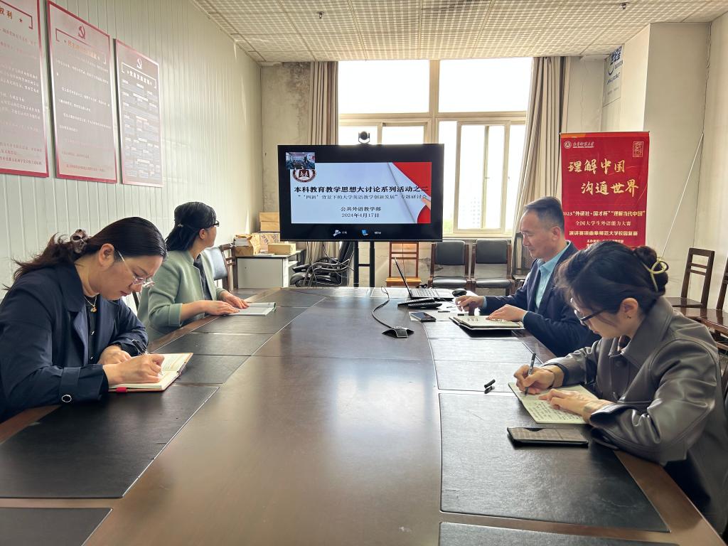 4月17日,开运体育·(中国)有限公司官网召开本科教育教学思想大讨论系列活动之二——“‘四新’背景下的大学英语教学创新发展”专题研讨会。研讨会由开运体育·(中国)有限公司官网主任王福祥主持,教学部领导班子全体成员和两校区教研室主任等业务骨干参加了本次研讨。