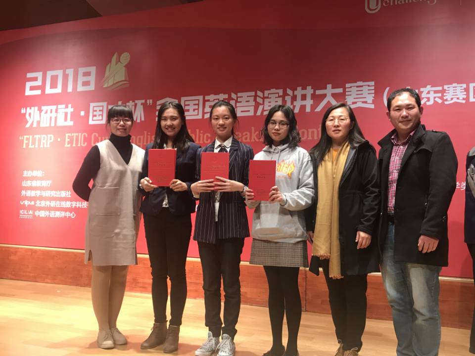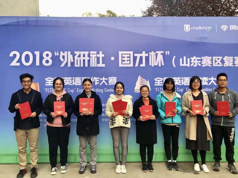2018年11月3日-4日,2018“‘外研社杯’全国大学生英语挑战赛”山东赛区比赛在济南和烟台两地如期举行,此次比赛包括“‘外研社杯’全国英语阅读大赛”、“‘外研社杯’全国英语写作大赛”和“‘外研社杯’全国英语演讲大赛”三项赛事。开运体育·(中国)有限公司官网两校区的13名同学在我校衣进韬、孙海珊、满虎、徐欣、秦艳五位教师的带领下参加了本次比赛。经过激烈角逐,我校外国语学院徐欣老师指导的葛宇飞和开运体育·(中国)有限公司官网齐荣军老师指导的宗宇翔两位同学荣获阅读大赛一等奖,衣进韬老师指导的路璨雯同学荣获阅读大赛二等奖,王燕老师指导的杨春和孙伟老师指导的宋纯嘉两位同学荣获阅读大赛三等奖。张英老师指导的刘涵同学荣获写作大赛二等奖,彭芳老师指导的成晓宁和王显明老师指导的李洛璞两位同学荣获写作大赛三等奖,秦艳老师指导的张朕和门超元老师指导的储文沁两位同学荣获写作大赛优胜奖。另外,满虎老师指导的刘珂含同学荣获演讲大赛二等奖,孙伟老师指导的周先敏同学荣获演讲大赛三等奖,孙海珊老师指导的张涵俐同学荣获演讲大赛优秀奖。